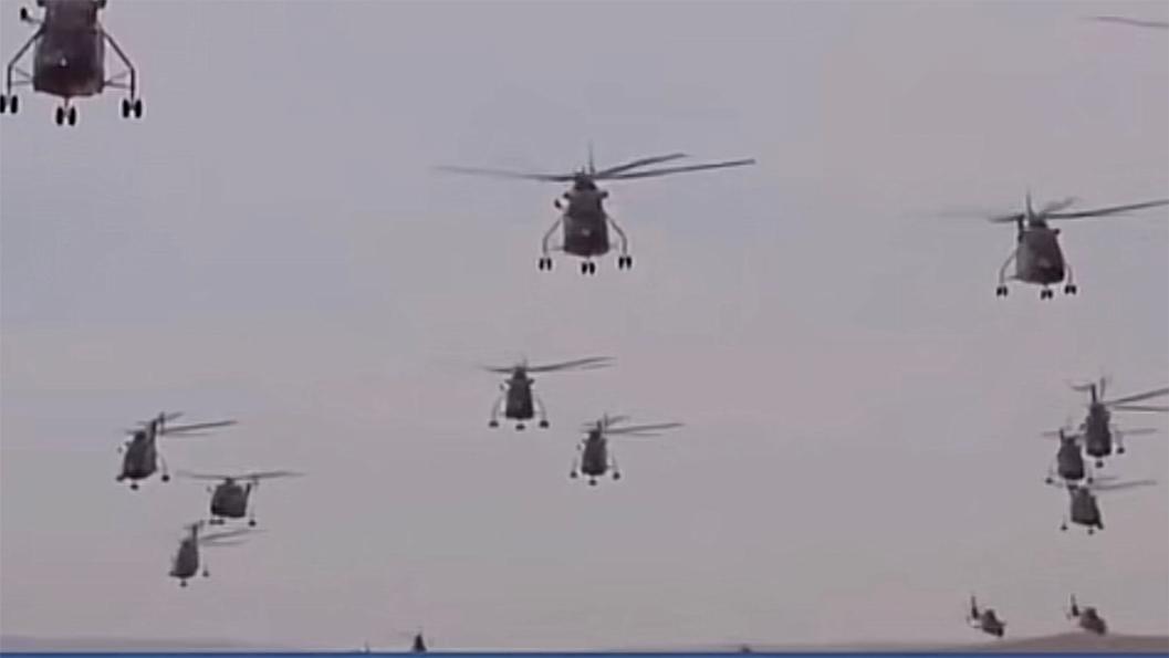 “快看飞机!好多直升机啊!”一个身穿防化服的战士,仰头透过防毒面具厚厚的镜片望向天空,语气无不羡慕的感叹道。